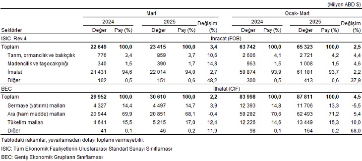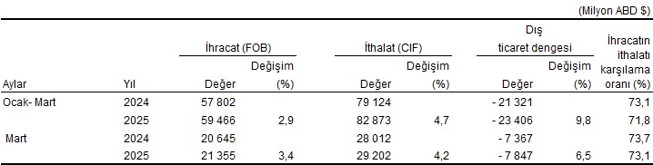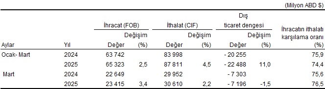 Türkiye İstatistik Kurumu ile Ticaret Bakanlığı iş birliğiyle genel ticaret sistemi kapsamında üretilen süreksiz dış ticaret bilgilerine nazaran; ihracat 2025 yılı Mart ayında, bir evvelki yılın birebir ayına nazaran %3,4 artarak 23 milyar 415 milyon dolar, ithalat %2,2 artarak 30 milyar 610 milyon dolar olarak gerçekleşti.