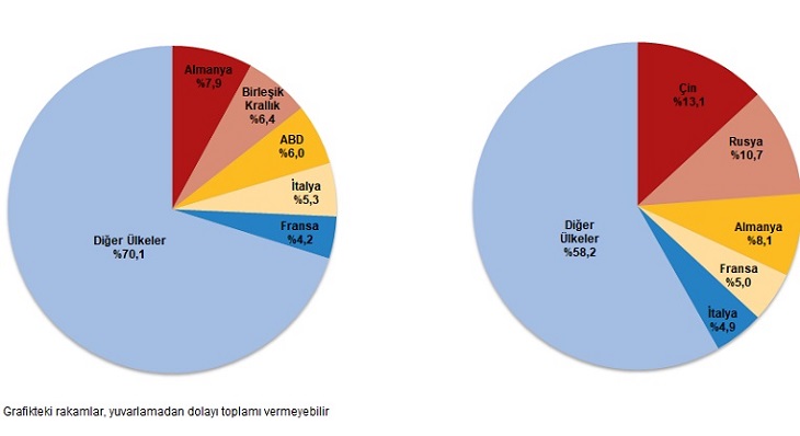 Ocak-Mart periyodunda ithalatta birinci sırayı Çin aldı. Çin’den yapılan ithalat 11 milyar 634 milyon dolar olurken, bu ülkeyi sırasıyla; 11 milyar 541 milyon dolar ile Rusya Federasyonu, 6 milyar 485 milyon dolar ile Almanya, 3 milyar 970 milyon dolar ile ABD, 3 milyar 679 milyon dolar ile İtalya izledi. Birinci 5 ülkeden yapılan ithalat, toplam ithalatın %42,5’ini oluşturdu.