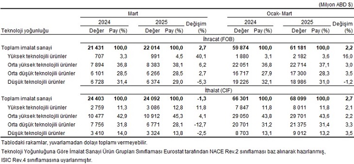 Teknoloji yoğunluğuna nazaran imalat sanayi eserleri dış ticareti, Mart 2025