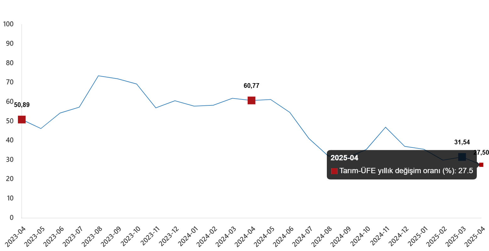 Tarım-ÜFE’de (2020=100), 2025 yılı Nisan ayında bir evvelki aya nazaran %0,45 azalış, bir evvelki yılın Aralık ayına nazaran %12,31 artış, bir evvelki yılın birebir ayına nazaran %27,50 artış ve on iki aylık ortalamalara nazaran %37,52 artış gerçekleşti.
