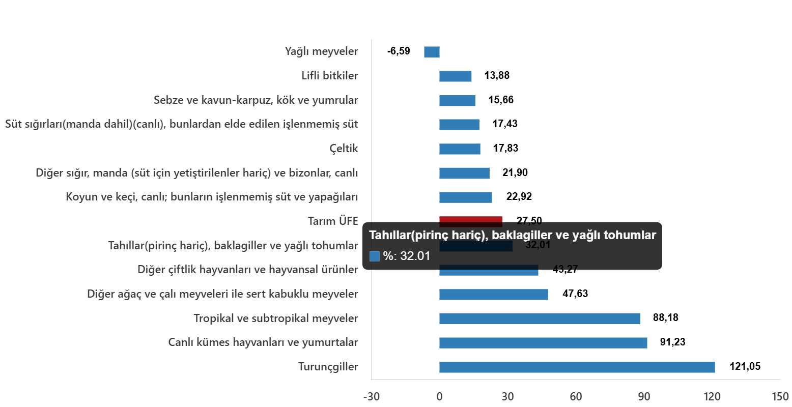 Tarım eserleri üretici fiyat endeksi (Tarım-ÜFE) yıllık %27,50 arttı, aylık %0,45 azaldı