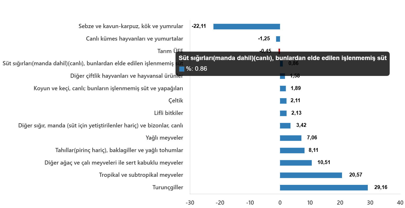 Sektörlerde bir evvelki aya nazaran, tarım ve avcılık eserleri ve ilgili hizmetlerde %0,86 azalış, ormancılık eserleri ve ilgili hizmetlerde %3,71 artış ve balık ve öbür balıkçılık eserleri; su eserleri; balıkçılık için destekleyici hizmetlerde %8,79 artış gerçekleşti. Ana kümelerde bir evvelki aya nazaran, tek yıllık (uzun ömürlü olmayan) bitkisel eserlerde %8,33 azalış, çok yıllık (uzun ömürlü) bitkisel eserlerde %13,20 artış ve canlı hayvanlar ve hayvansal eserlerde %1,54 artış gerçekleşti.