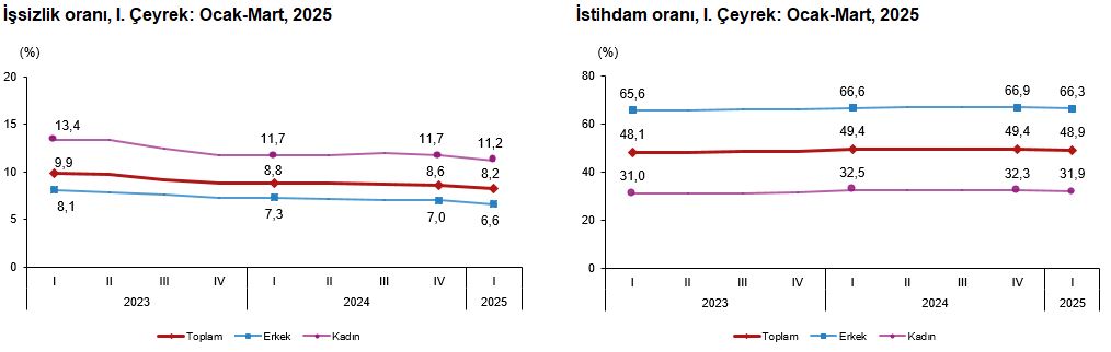 İstihdam edilenlerin sayısı 2025 yılı I. çeyreğinde bir evvelki çeyreğe nazaran 266 bin kişi azalarak 32 milyon 389 bin kişi, istihdam oranı ise 0,5 puanlık azalış ile %48,9 oldu. Bu oran erkeklerde %66,3 iken bayanlarda %31,9 olarak gerçekleşti.