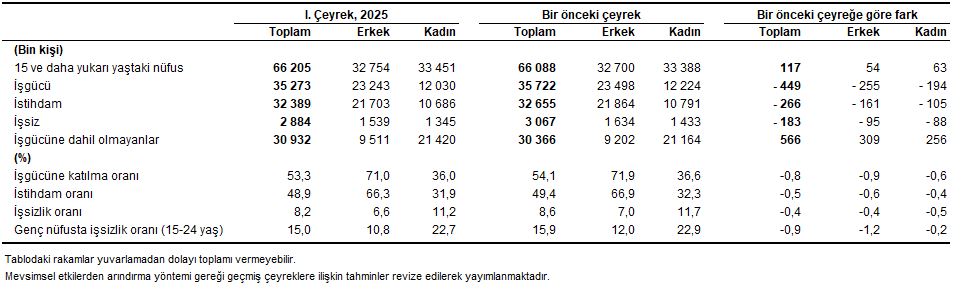 İşgücü 2025 yılı I. çeyreğinde bir evvelki çeyreğe nazaran 449 bin kişi azalarak 35 milyon 273 bin kişi, işgücüne katılma oranı ise 0,8 puanlık azalış ile %53,3 olarak gerçekleşti. İşgücüne katılma oranı erkeklerde %71,0, bayanlarda ise %36,0 oldu.