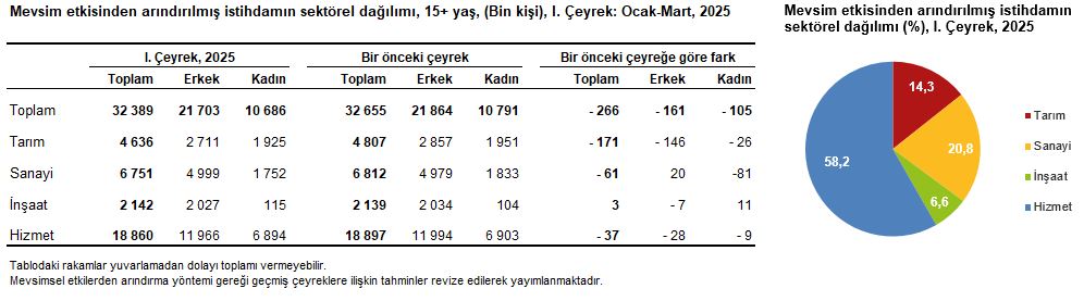 Mevsim tesirinden arındırılmış istihdam edilenlerin sayısı 2025 yılı I. çeyreğinde bir evvelki çeyreğe nazaran tarım bölümünde 171 bin kişi, sanayi dalında 61 bin kişi, hizmet dalında 37 bin kişi azalırken inşaat bölümünde 3 bin kişi arttı. İstihdam edilenlerin %14,3’ü tarım, %20,8’i sanayi, %6,6’sı inşaat, %58,2’si ise hizmet bölümünde yer aldı.