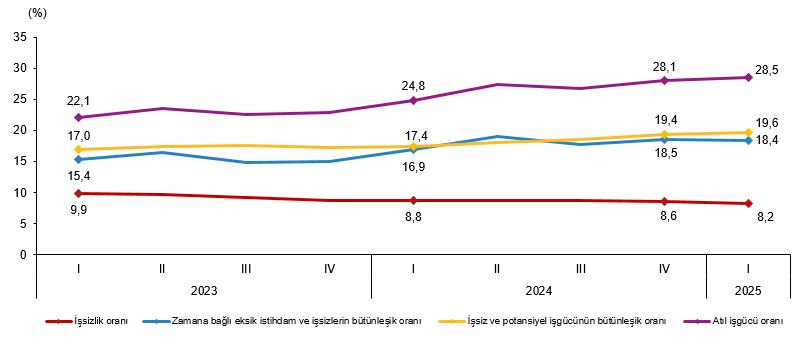 Zamana bağlı eksik istihdam, potansiyel işgücü ve işsizlerden oluşan atıl işgücü oranı 2025 yılı I. çeyreğinde bir evvelki çeyreğe nazaran 0,4 puanlık artış ile %28,5 oldu. Vakte bağlı eksik istihdam ve işsizlerin bütünleşik oranı %18,4 iken potansiyel işgücü ve işsizlerin bütünleşik oranı %19,6 olarak iddia edildi.