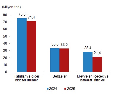Üretim ölçülerinin, 2025 yılı birinci iddiasında bir evvelki yıla nazaran tarla eserleri olan tahıllar ve başka bitkisel eserlerde (yem bitkileri hariç) %5,3, sebzelerde %1,7, meyveler, içecek ve baharat bitkilerinde %24,4 oranında azalacağı varsayım edildi. Buna nazaran, yaklaşık üretim ölçülerinin tahıllar ve başka bitkisel eserlerde 71,4 milyon ton, sebzelerde 33 milyon ton, meyveler, içecek ve baharat bitkilerinde ise 21,4 milyon ton olarak gerçekleşeceği öngörüldü.