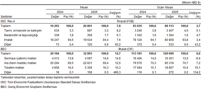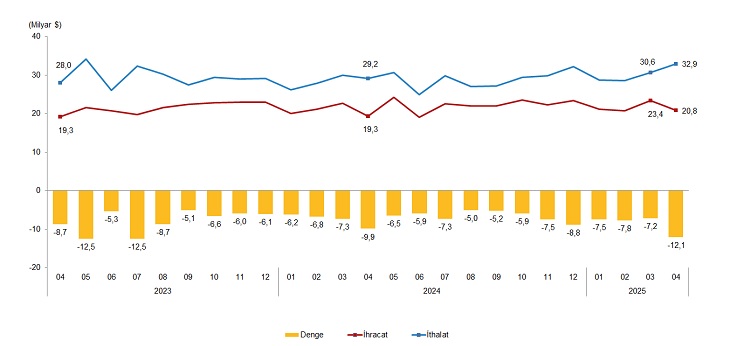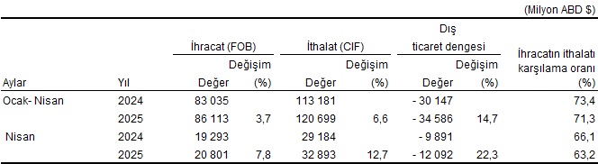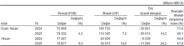 Türkiye İstatistik Kurumu ile Ticaret Bakanlığı iş birliğiyle genel ticaret sistemi kapsamında üretilen süreksiz dış ticaret datalarına nazaran; ihracat 2025 yılı Nisan ayında, bir evvelki yılın birebir ayına nazaran %7,8 artarak 20 milyar 801 milyon dolar, ithalat %12,7 artarak 32 milyar 893 milyon dolar olarak gerçekleşti.