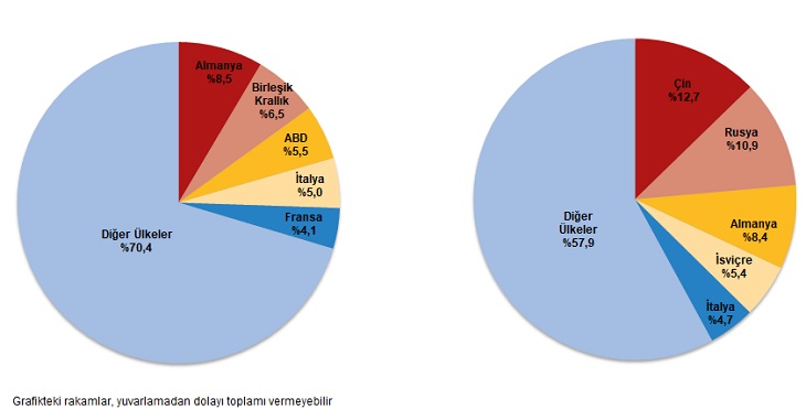 Ocak-Nisan periyodunda ihracatta birinci sırayı Almanya aldı. Almanya’ya yapılan ihracat 7 milyar 95 milyon dolar olurken, bu ülkeyi sırasıyla; 5 milyar 377 milyon dolar ile Birleşik Krallık, 5 milyar 130 milyon dolar ile ABD, 4 milyar 352 milyon dolar ile İtalya ve 3 milyar 758 milyon dolar ile Irak takip etti. Birinci 5 ülkeye yapılan ihracat, toplam ihracatın %29,9’unu oluşturdu.