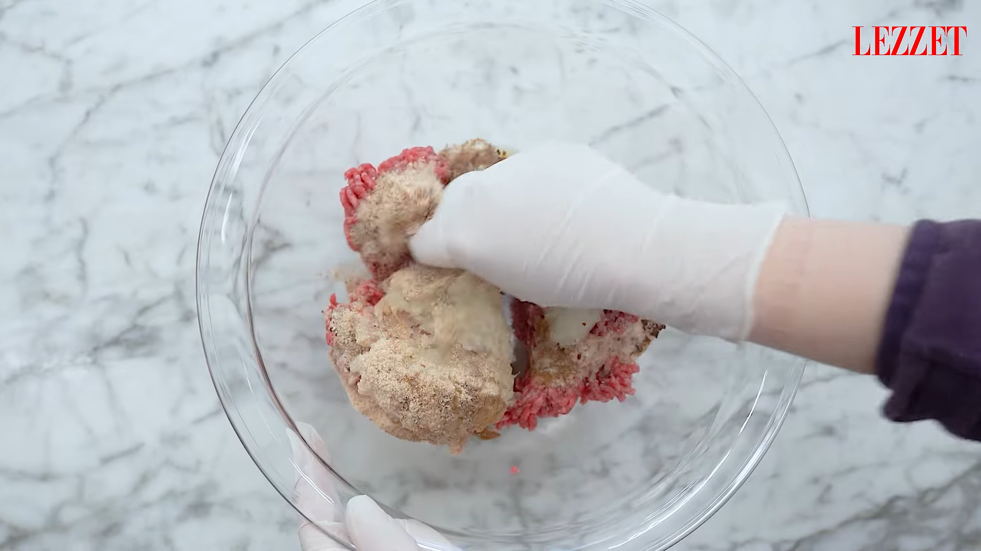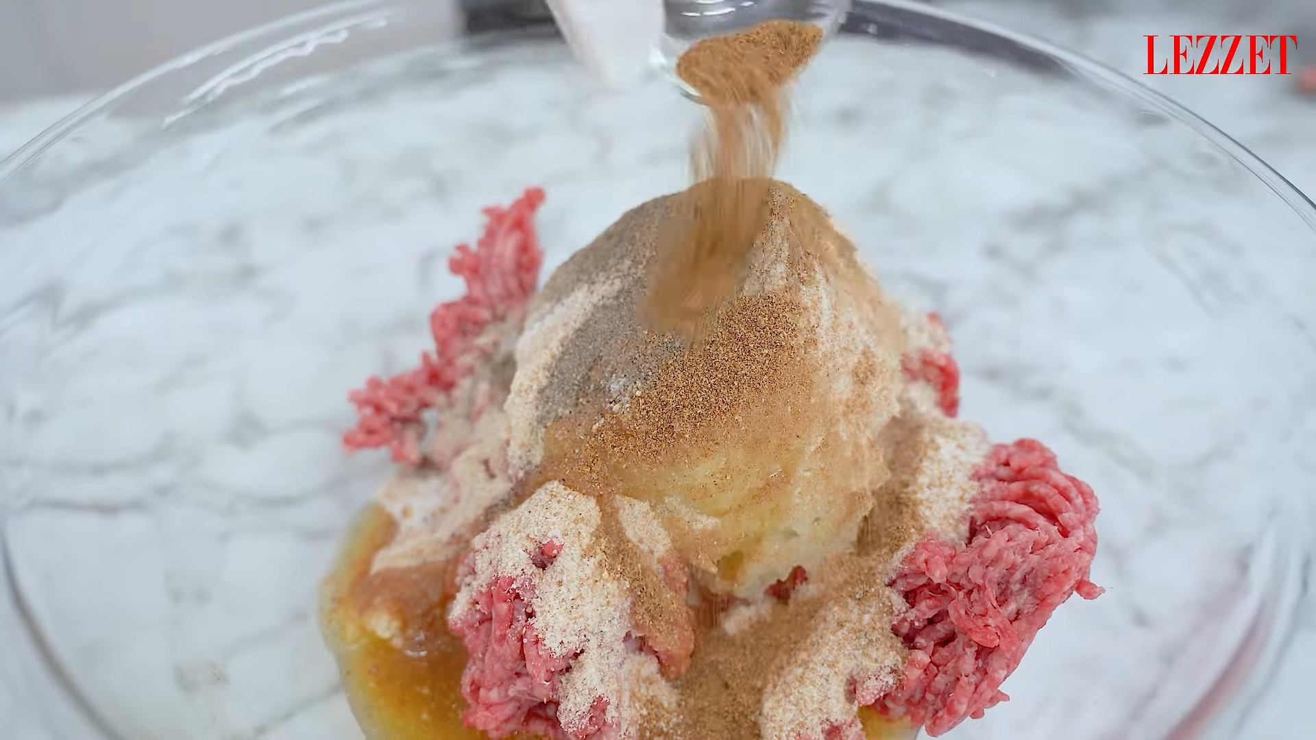 - Kıymayı geniş bir kaba alın. Üzerine rendelenmiş soğan, ezilmiş sarımsak, galeta unu, zeytinyağı ve baharatları ekleyin.
