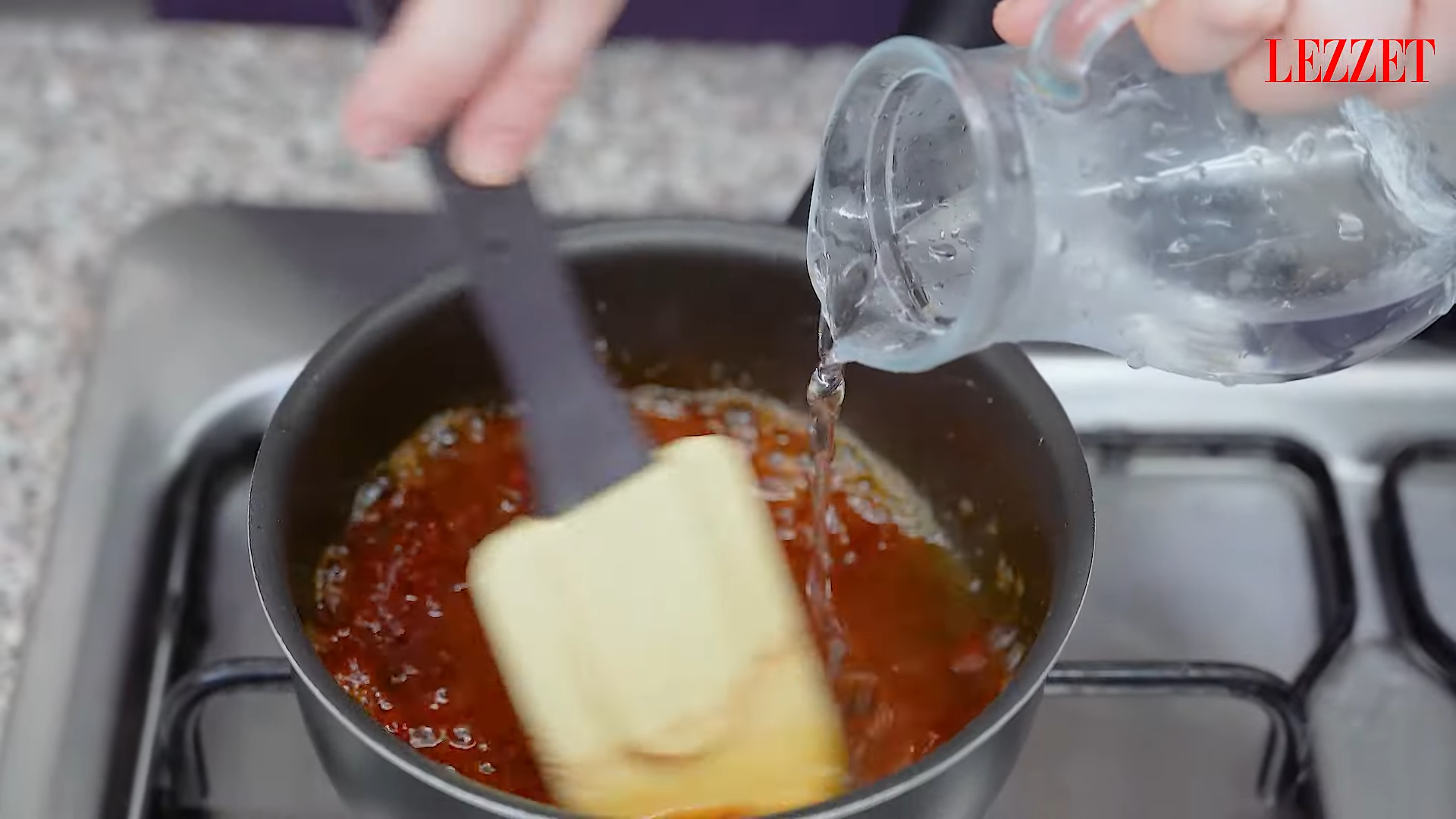 - Küçük bir sos tavasında tereyağını eritin. Üzerine domates salçasını ekleyip birkaç dakika kavurun. Ardından sıcak suyu ilave ederek sos kıvam alana kadar karıştırın.