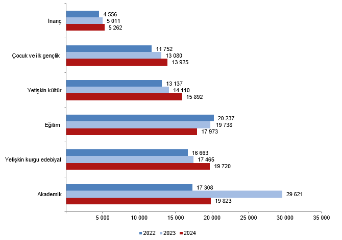 Yayımlanan malzemelerin sayısı 2024 yılında, 2023 yılına nazaran %6,5 azalarak 92 bin 595 oldu. Yayınlar bahislerine nazaran incelendiğinde 2024 yılında yayımlanan gereçlerin %21,4’ünün akademik, %21,3’ünün yetişkin kurgu edebiyat, %19,4’ünün ise eğitim olduğu görüldü.