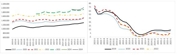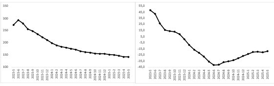 Şekil 1: Ortalama araba gerçek fiyatı (2020 Ocak=100) (Sol panel), ortalama araba gerçek fiyatının yıllık değişimi (%) (Sağ panel)