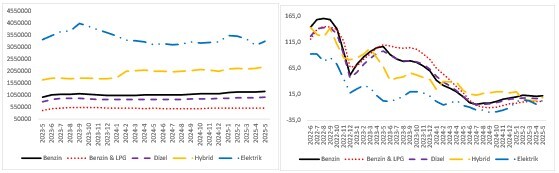 Şekil 4: Yakıt cinsine nazaran ortalama araba fiyatı (TL) (Sol panel), yakıt çeşidine nazaran ortalama araba fiyatının yıllık değişimi (%) (Sağ panel)