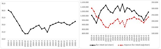 Şekil 5: Satılan araba sayısının satılık araba ilan sayısına oranı (%) (Sol panel), satılan ve satılık araba sayısı (Sağ panel)