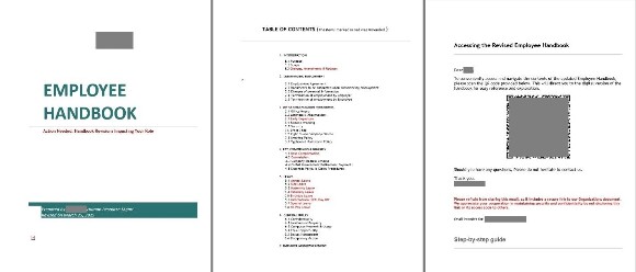 Güncellenmiş “Çalışan El Kitabı” üzere görünen ekteki evrak gerçek bir kılavuz içermiyor. Yalnızca bir başlık sayfası, kelamda değiştirilen unsurların kırmızıyla vurgulandığı bir içindekiler tablosu, kelamda evrakın tamamına gitmek için bir QR kodu içeren bir sayfa ve bir telefon kullanarak QR kodlarının nasıl okunacağına dair genel talimatlar yer alıyor. Dokümanda bu evrakın bilhassa kendileri için oluşturulduğuna ikna etmek için kurbanın ismi birçok sefer yer alıyor.