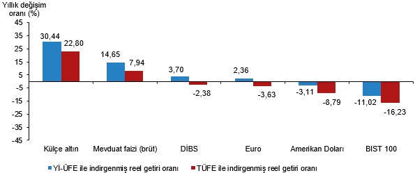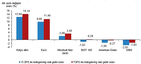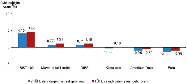 Yİ-ÜFE ile indirgendiğinde; yatırım araçlarından, mevduat faizi (brüt) %0,77 ve Devlet İç Borçlanma Senetleri (DİBS) %0,71 oranlarında yatırımcısına gerçek getiri sağlarken; külçe altın %0,33, Amerikan Doları %0,95 ve Euro %1,39 oranlarında yatırımcısına kaybettirdi. TÜFE ile indirgendiğinde ise mevduat faizi (brüt) %1,21, DİBS %1,15 ve külçe altın %0,10 oranlarında yatırımcısına gerçek getiri sağlarken; Amerikan Doları %0,52 ve Euro %0,96 oranlarında yatırımcısına kaybettirdi.