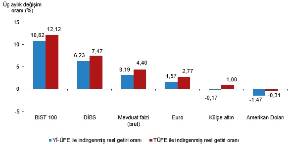 BIST 100 endeksi, üç aylık değerlendirmede; Yİ-ÜFE ile indirgendiğinde %10,82, TÜFE ile indirgendiğinde ise %12,12 oranlarında yatırımcısına en yüksek gerçek getiri sağlayan yatırım aracı oldu. Tıpkı periyotta Amerikan Doları; Yİ-ÜFE ile indirgendiğinde %1,47, TÜFE ile indirgendiğinde ise %0,31 oranlarında yatırımcısına en çok kaybettiren yatırım aracı oldu.