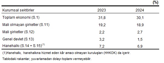 Toplam gayrisafi tasarrufun GSYH’ye oranı 2024 yılında toplam iktisat için %30,1 oldu. Bu oran mali olmayan şirketler için %18,9 hanehalkı için %6,9 mali şirketler için %2,7 ve genel devlet için %1,5 oldu.