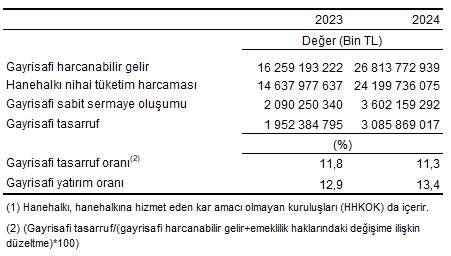 Gayrisafi hanehalkı tasarruf oranı 2024 yılı için %11,3 oldu