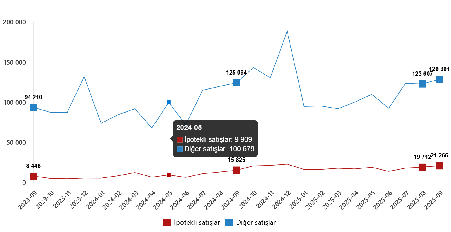| İpotekli satış | 21 266 | 15 825 | 34,4 | 162 493 | 92 310 | 76,0 |