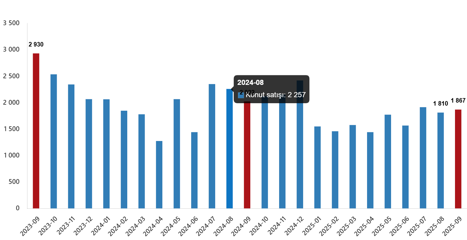 Türkiye genelinde konut satışları Eylül ayında bir evvelki yılın tıpkı ayına nazaran %6,9 oranında artarak 150 bin 657 oldu. Konut satış sayısının en fazla olduğu vilayetler sırasıyla 24 bin 119 ile İstanbul, 13 bin 417 ile Ankara ve 8 bin 544 ile İzmir olurken, en az olduğu vilayetler sırasıyla 70 ile Ardahan, 117 ile Bayburt ve 142 ile Tunceli olarak gerçekleşti.