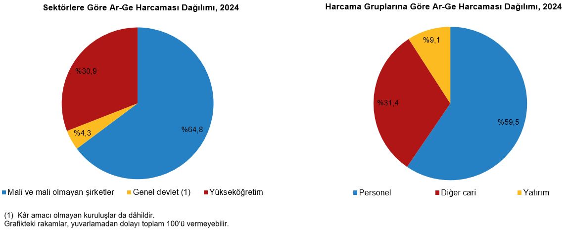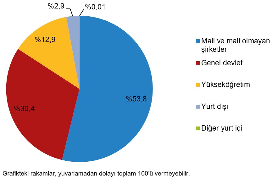 Ar-Ge harcamalarında mali ve mali olmayan şirketler %64,8 ile en büyük hisseye sahip olurken, bunu %30,9 ile yükseköğretim takip etti. Kâr gayesi olmayan kuruluşlar tarafından yapılan Ar-Ge harcamalarının da dâhil olduğu genel devlet Ar-Ge harcamalarının toplam Ar-Ge harcamaları içindeki hissesi ise %4,3 oldu. Ar-Ge harcamaları içerisinde işçi harcamaları %59,5 ile en büyük harcama kalemini oluşturdu.