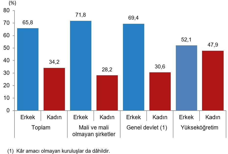 TZE cinsinden bayan Ar-Ge işçi sayısı, 2024 yılında 106 bin 74 kişi ile toplam Ar-Ge işçi sayısının %34,2’sini oluşturdu. Bölümler prestijiyle TZE cinsinden bayan Ar-Ge işçi oranı yükseköğretimde %47,9, kâr hedefi olmayan kuruluşların da dâhil edildiği genel devlette %30,6, mali ve mali olmayan şirketlerde ise %28,2 oldu.