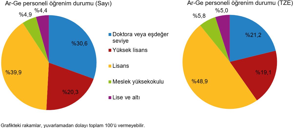 Ar-Ge işçisi tahsil durumuna nazaran incelendiğinde, Ar-Ge işçisinin %39,9’unun lisans eğitim seviyesine sahip olduğu görüldü. Bunu sırasıyla %30,6 ile doktora yahut muadili, %20,3 ile yüksek lisans, %4,9 ile meslek yüksekokulu ve %4,4 ile lise ve altı kategorileri takip etti. TZE cinsinden Ar-Ge işçisinin eğitim durumuna nazaran dağılımı ise sırasıyla; %48,9 ile lisans, %21,2 ile doktora yahut muadili, %19,1 ile yüksek lisans, %5,8 ile meslek yüksekokulu ve %5,0 ile lise ve altı eğitim seviyesi biçiminde oldu.