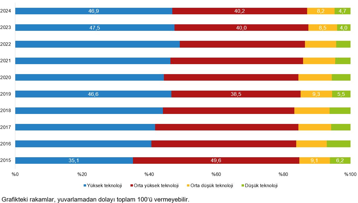 İmalat endüstrinde Ar-Ge faaliyeti yürüten teşebbüsler teknoloji seviyelerine nazaran sınıflandırıldığında, 2024 yılında imalat endüstrinde gerçekleştirilen 210 milyar 506 milyon TL Ar-Ge harcamasının %46,9’unun yüksek teknoloji faaliyetinde yer alan teşebbüsler tarafından gerçekleştirildiği görüldü. İmalat sanayindeki toplam Ar-Ge harcamasının %40,2’si orta yüksek teknoloji faaliyetindeki teşebbüsler, %8,2’si orta düşük teknoloji faaliyetindeki teşebbüsler ve %4,7’si düşük teknoloji faaliyetindeki teşebbüsler tarafından yapıldı.