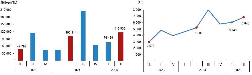 Toplam seyahat harcamaları, II. Çeyrek, 2025                            Seyahat başı ortalama harcama, II. Çeyrek, 2025