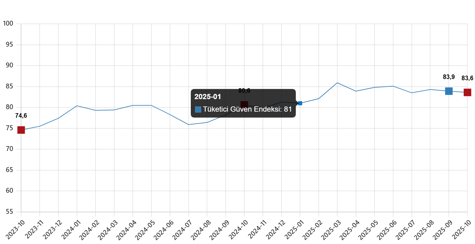 Türkiye İstatistik Kurumu ve Türkiye Cumhuriyet Merkez Bankası işbirliği ile yürütülen tüketici eğilim anketi sonuçlarından hesaplanan tüketici inanç endeksi, Eylül ayında 83,9 iken Ekim ayında %0,3 oranında azalarak 83,6 oldu.
